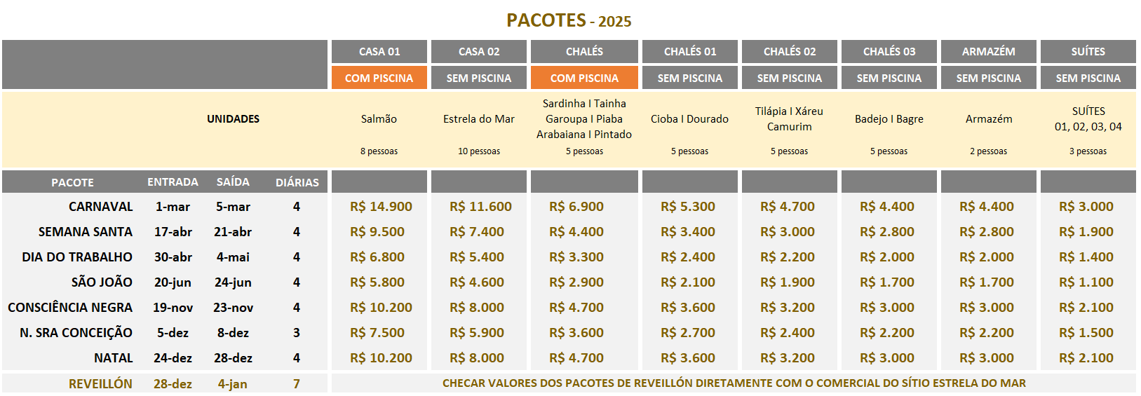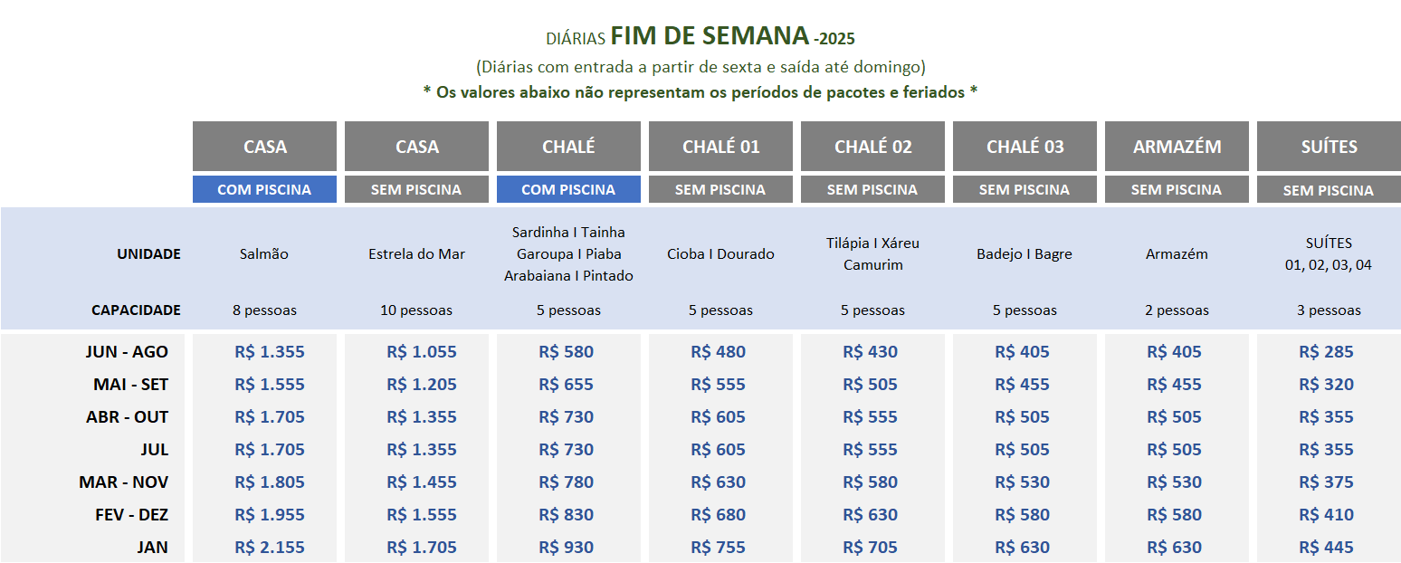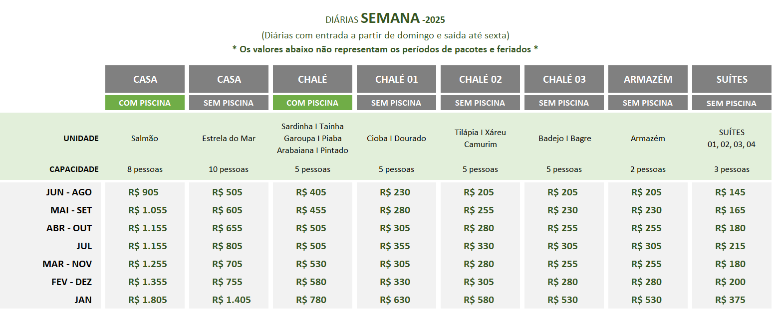 * Nossa proposta é Casa de Praia, dessa forma os valores das diária não incluem roupa de cama, banho e refeições.